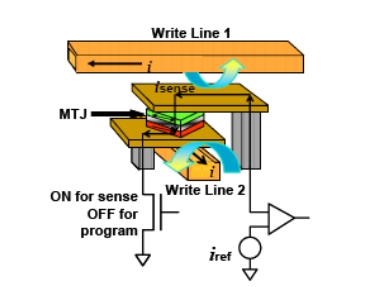 實(shí)現(xiàn)MRAM可靠存儲(chǔ)的一個(gè)主要障礙是高位干擾率。對(duì)目標(biāo)位進(jìn)行編程時(shí),非目標(biāo)位中的自由層會(huì)被誤編程。目前飛思卡爾半導(dǎo)體研究人員已經(jīng)成功解決了此問(wèn)題,其方法是,在每次出現(xiàn)位狀態(tài)空翻時(shí),產(chǎn)生一個(gè)跳變位,它將磁矩的方向旋轉(zhuǎn)到同一方向。寫入線1和寫入線2上的反轉(zhuǎn)脈沖電流使極性旋轉(zhuǎn),從而不會(huì)干擾相同行或列的其它位元。